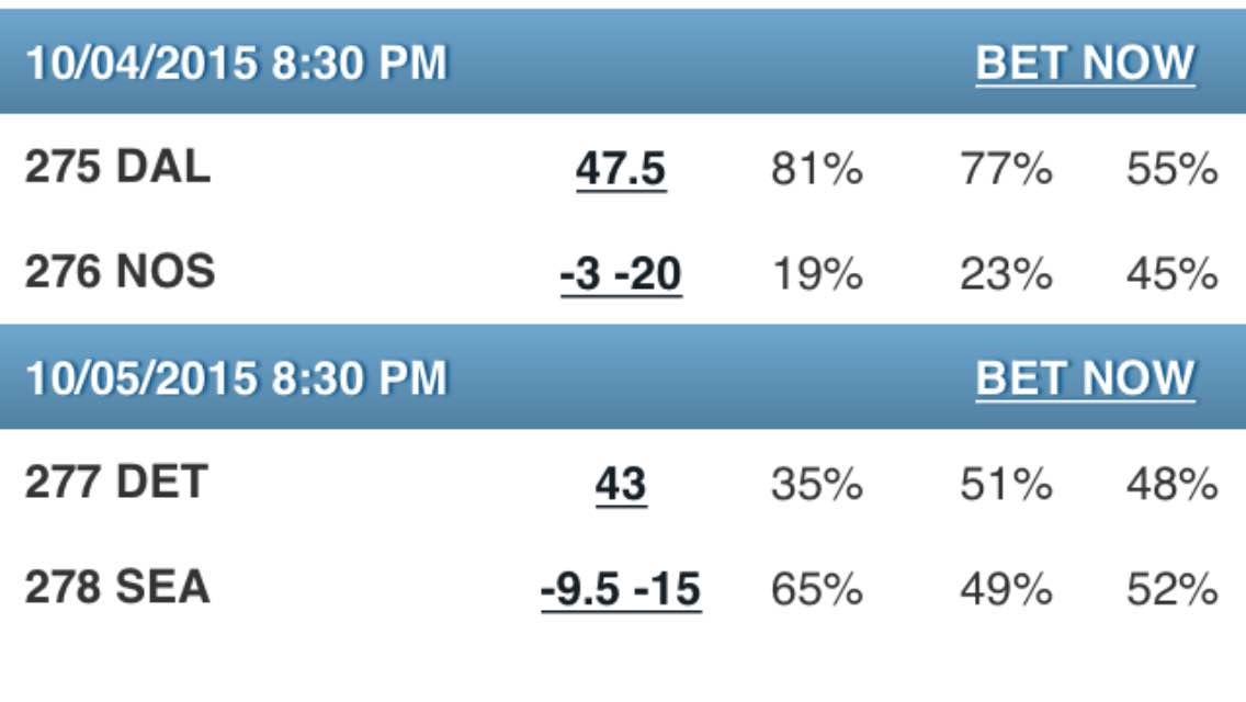 The trend swing on the DAL/NO side bet was pretty severe since my post data. From 12am EST Sunday morning, the COWBOYS +3 plummeted from 81% to 44% by kickoff. So glad that happened. It gives me a perfect example to explain the following.