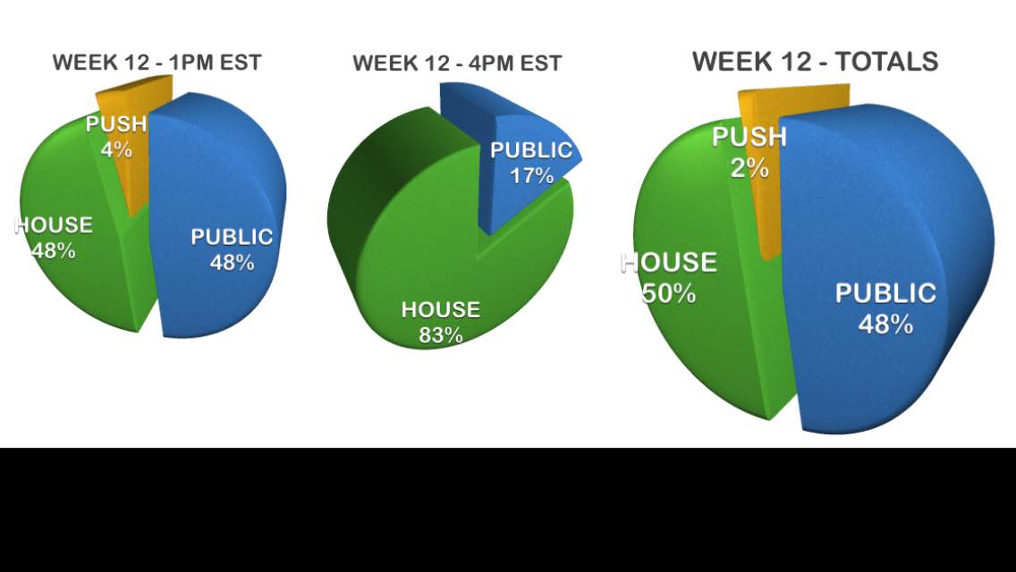 Faced with my first 1-5 performance this season, the gambling gods decided to cut me some slack and let me off the hook with another 2-4 week. The only thing I predicted right, going into last week’s action, was that the public would definitely win a side bet, which only happened thanks to a miracle field goal block returned for a game winning touchdown. I’ll take it, after that SNF screw job.