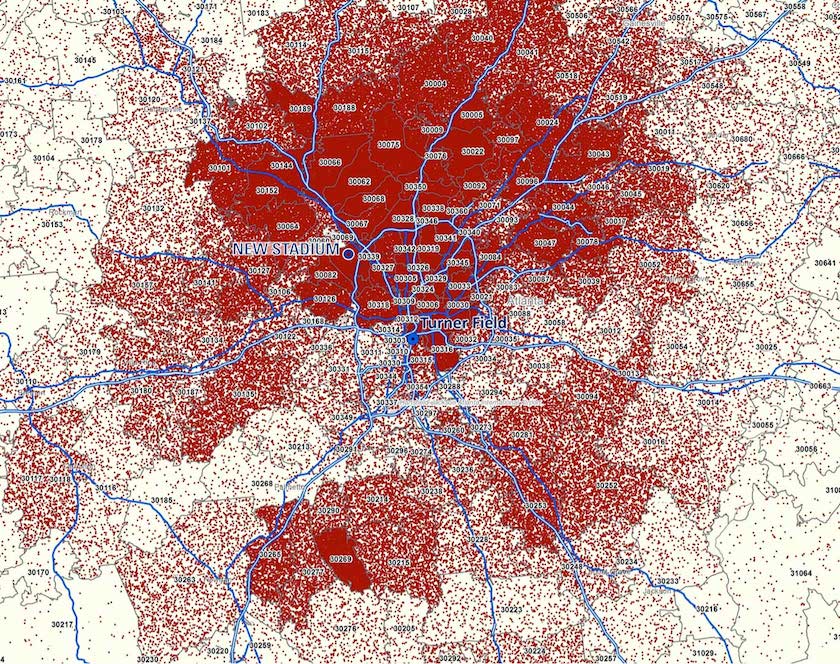 The Braves thought it would be best to build the stadium as close to the ticket-buying majority as possible. Seems pretty smart to me. This map shows where these ticket buyers live.