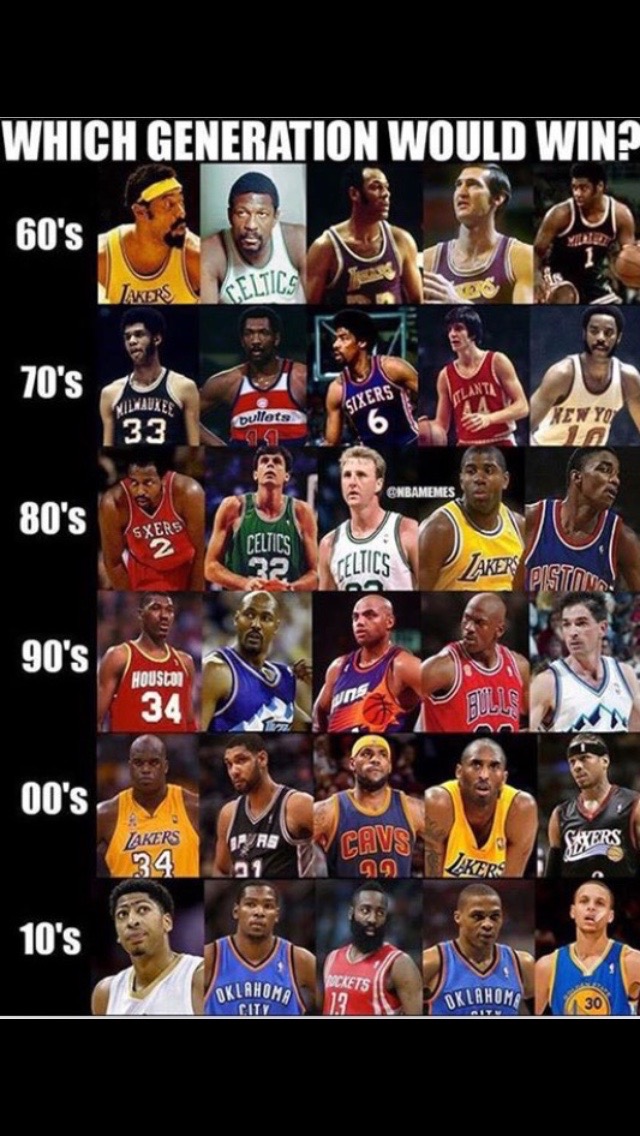 So I have to eliminate the 60s and 70s from contention. And no matter how much I gloat about growing up in the greatest era of basketball with The Dream Team and Magic and Bird and Sir Charles and MJ, I think the winner in this hypothetical championship is the 2000s (with my addition of J-Kidd, probably even without him).